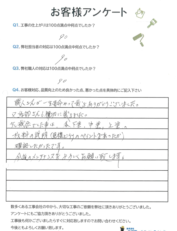少し残念でしたことは、各下塗り、中塗り、上塗りの材料の説明(見積り通りのペイントがあったか)確認したかったです。