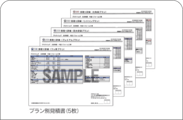 プロタイムズでは、10種類以上の塗装プランの中から、お住まいの状態・ご予算にあわせて厳選した5つの塗装プランをお見積もりとしてご提案します。お見積もりは5種類すべて、外装リフォーム図面で算出した正確な塗装面積に基づいた適正価格でご提案。お住まいへのご希望やご予算にあわせて塗装プランを柔軟にご検討いただけます。