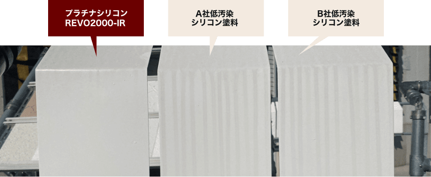 塗膜表面に汚れが付きにくい特殊構造のシリコン樹脂を採用。一般的な低汚染シリコン塗料と比較して雨筋汚れが付きにくく、塗り替え後の美しさを保持することが確認されています